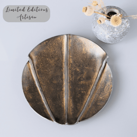 This iron dish with 3 folds creates a unique look. With gold gilt it is reminiscent of the bodice of a flamboyant ball gown, or the lines on a scallop shell. Either way, this eye catching, unique, and functional piece will charm anyone with its seductive and luxurious lines.