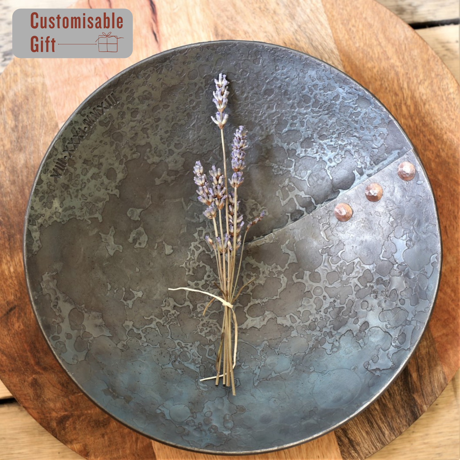 Your iron bowl can be personalised to create a totally unique gift for your anniversary or special occasion. I can hand stamp up to 10 numbers / characters on the underside of the bowl using individual vintage letter & number punches.
