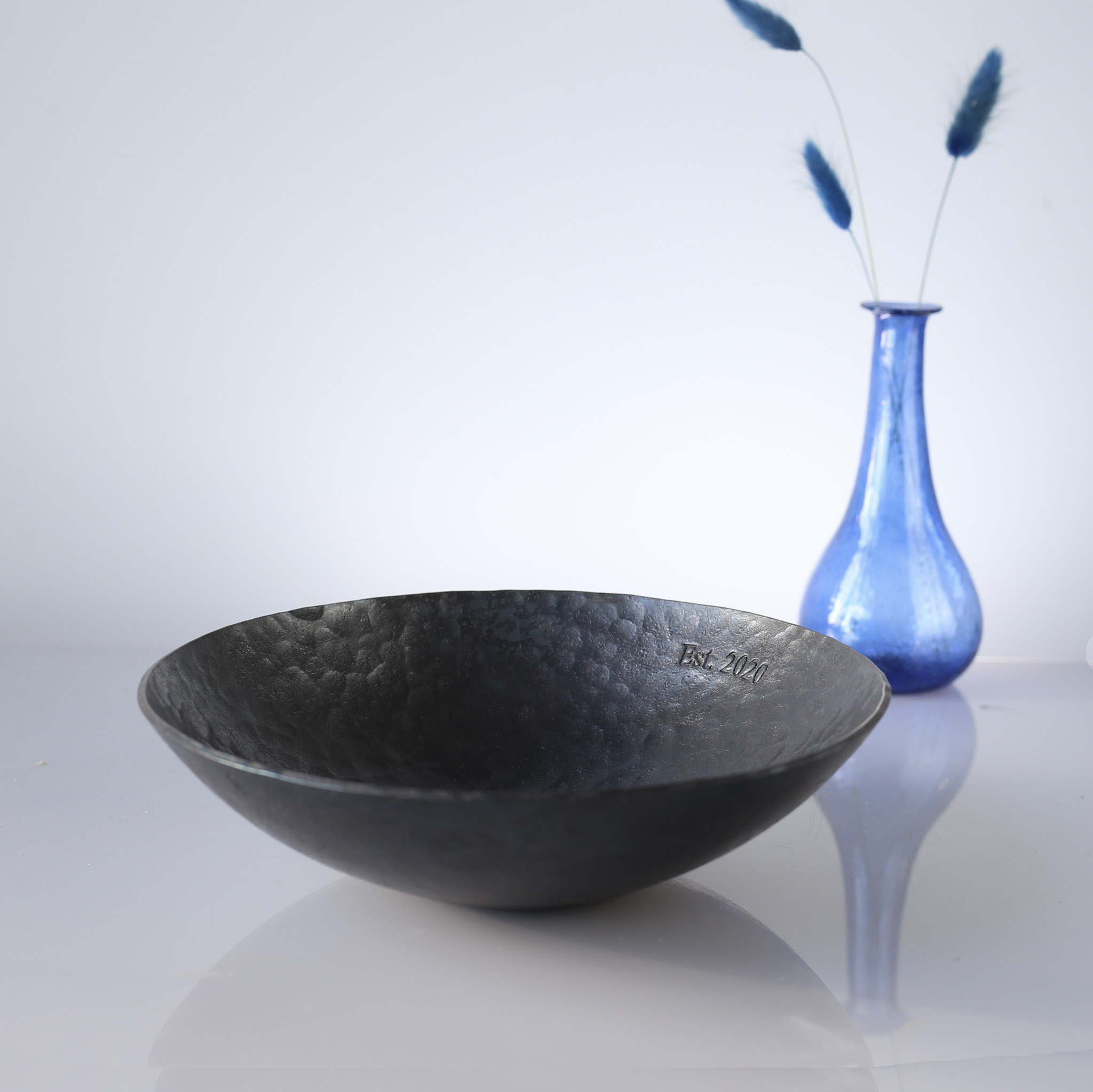 The Bowls are traditionally forged using an anvil and hammer, each hammer blow can be seen in the surface of the bowl giving it a beautiful texture. The surface is then treated with several coats of ‘Renaissance Wax’ to create an attractive and protective patina. The real beauty of the iron shines through.