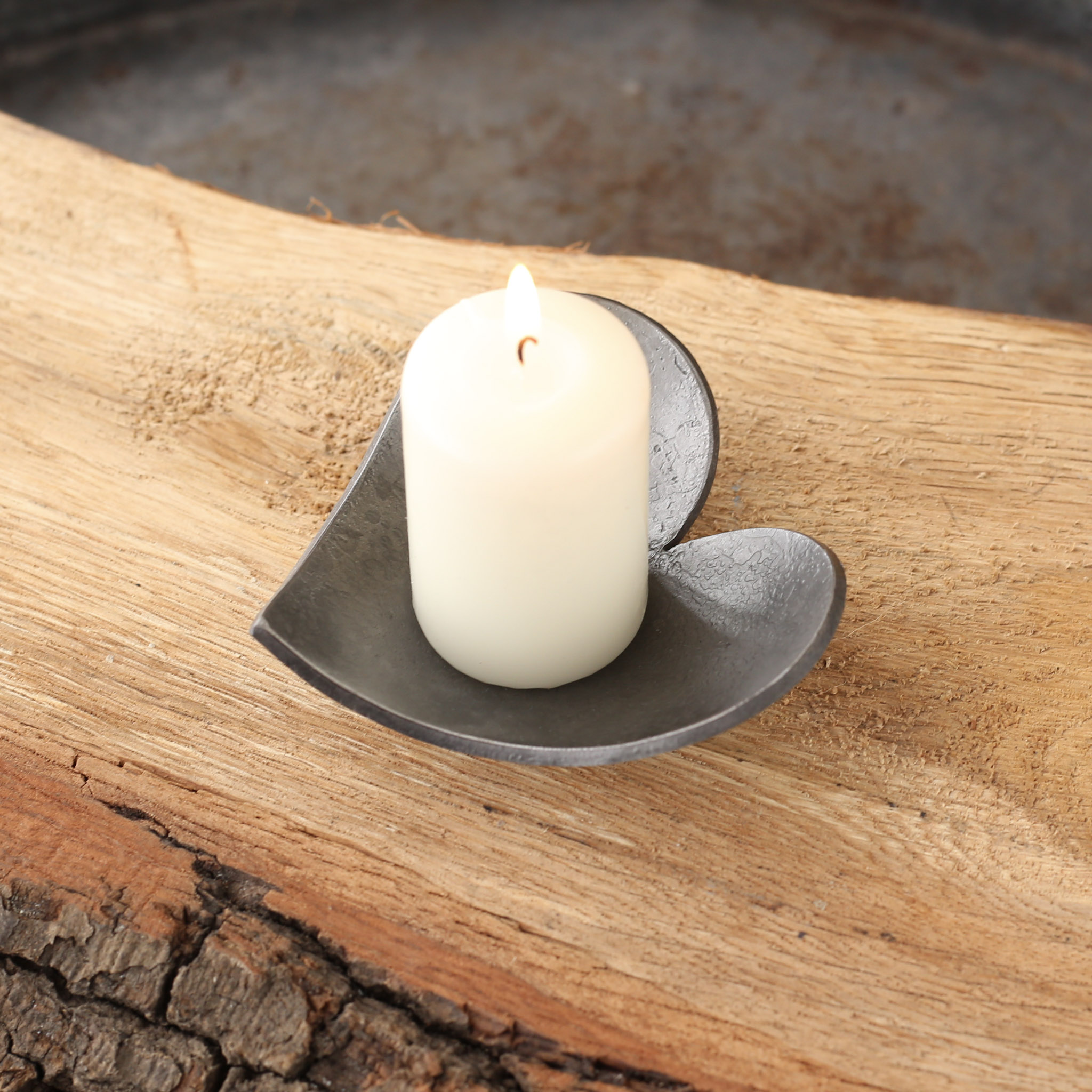 Beautiful handmade iron love heart trinket dish. With silver/grey metallic finish the smooth curved dish is great for holding earrings, candles or displayed as it is. Displayed on a rustic wooden board the dish holds a small ivory pillar candle. Unique anniversary gift.